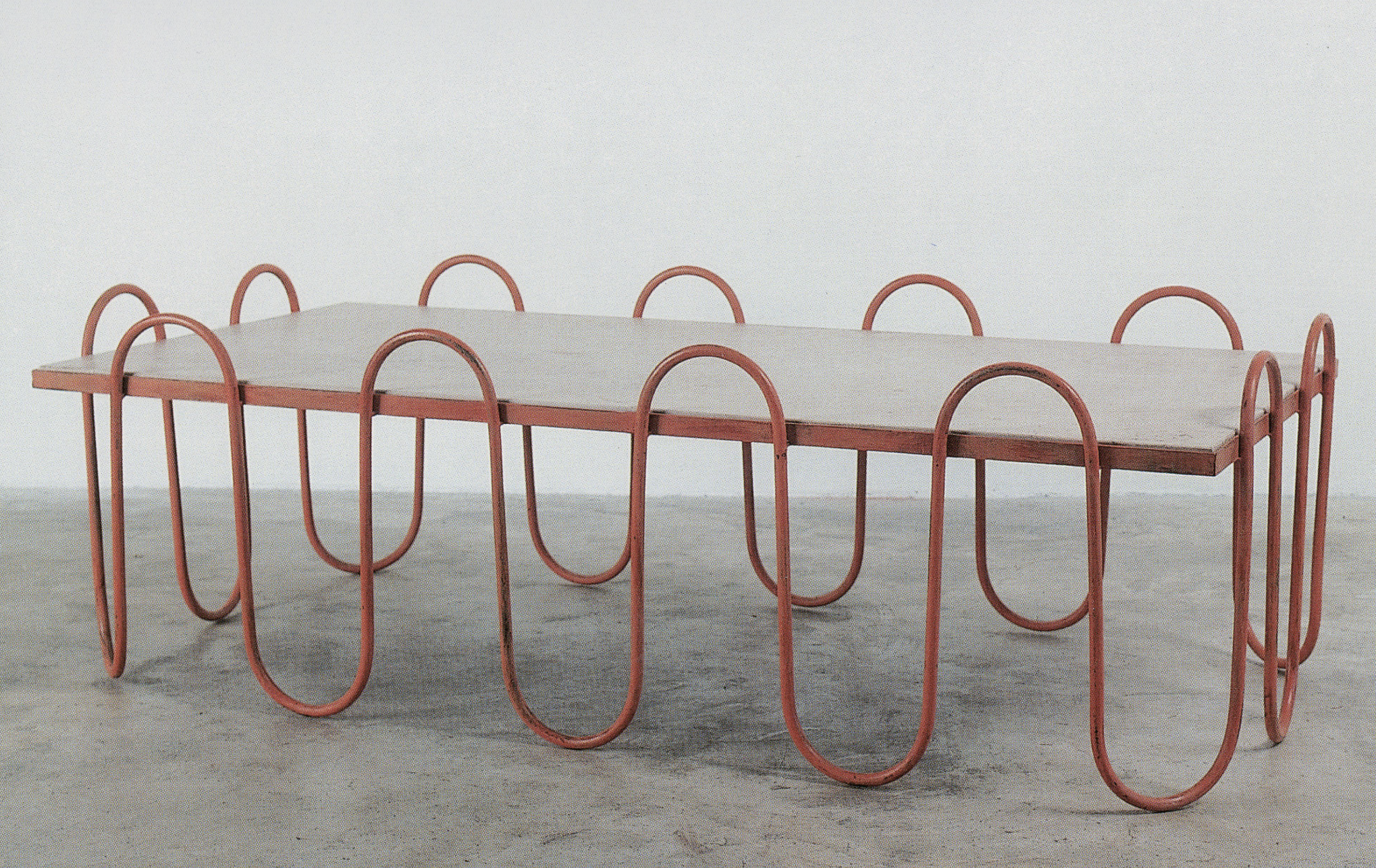Dedicated to supporting the creation of contemporary and limited edition works, Galerie kreo (Paris) will present exclusive designs by pioneering contemporary designers. Contemporary highlights include Ronan Bouroullec’s Flou console—featuring a bold fusion of materials, this piece pairs a silver mirrored cast-glass top with a hammered silver metal base. The thick glass surface encapsulates a fluid, wave-like pattern within, creating a sense of organic movement and dynamic textures. Meanwhile, Marco Campardo’s butter yellow Jello bench epitomizes Campardo’s pioneering creativity; created using moulds made from laminated cardboard, the resulting bench exhibits a lasting imprint of these subtle creases and lines. These designs are placed in dialogue with exceptional works by French and Italian masters of 20th century lighting, including Gino Sarfatti’s 1050/2 Floor light, dating to 1951. Composed of a black marble base, brass stem, and two lacquered metal lampshades in black and yellow, the lamp provides a striking yet complementary contrast to the adjacent console and bench.